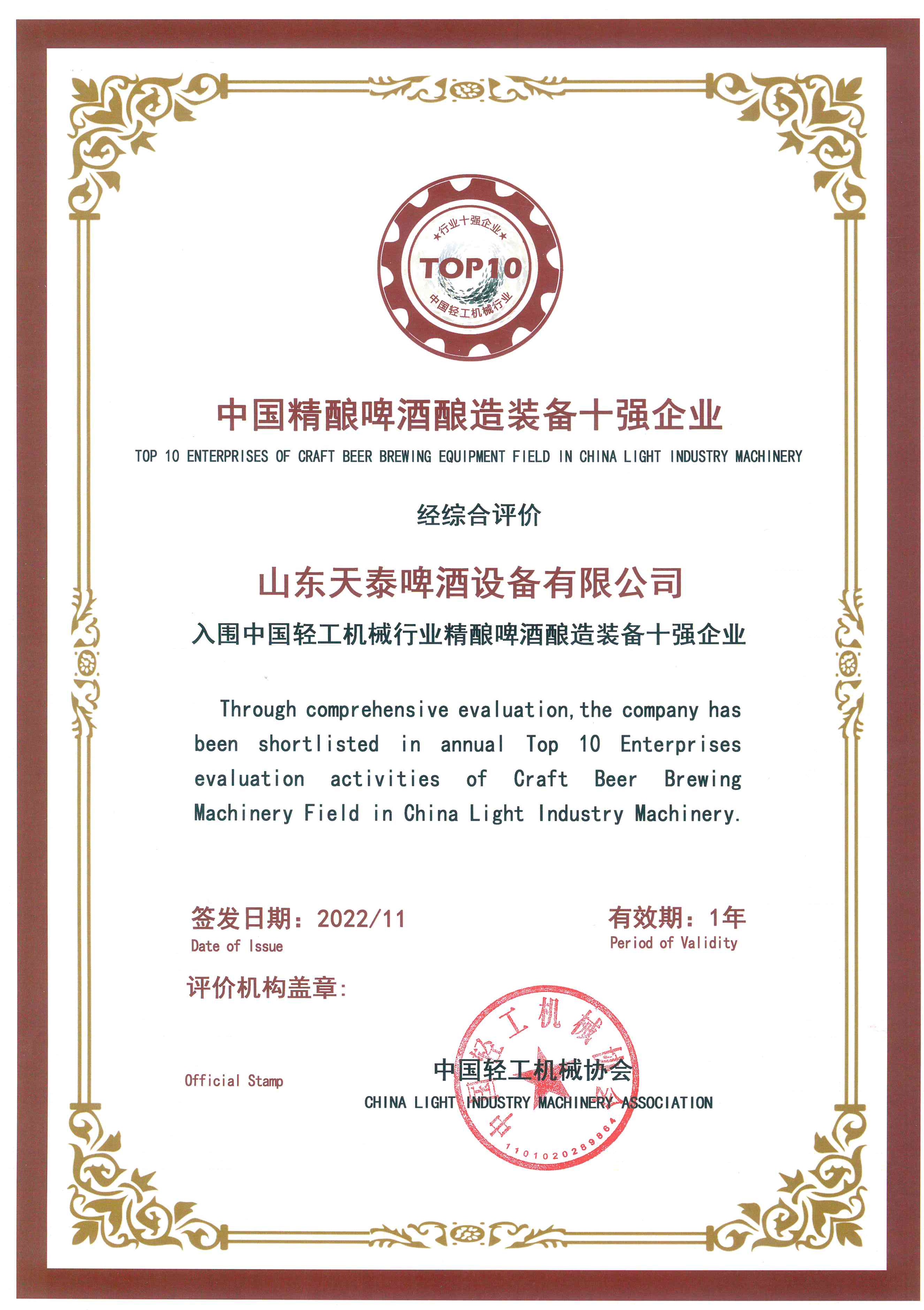 此項榮譽是對天泰10年持續創新,持續研發,不斷進步的肯定,天泰人定將不忘初心,砥礪前行!為中國精釀行業和酒類飲料生產專用設備制造業的發展貢獻力量!